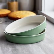 - Prepare to bake—Preheat the oven to 350°F. Grease (with butter) and flour two 8” round cake pans.