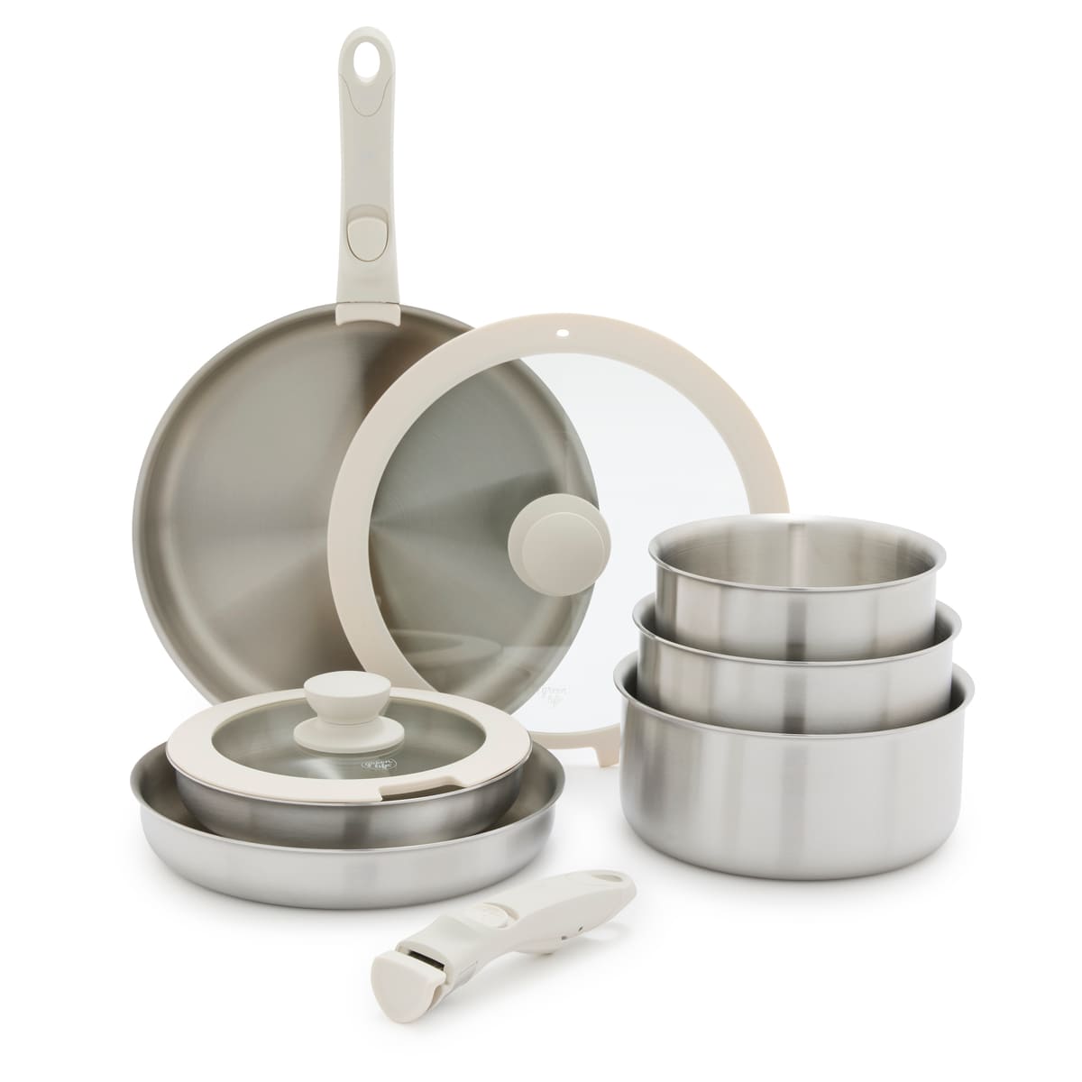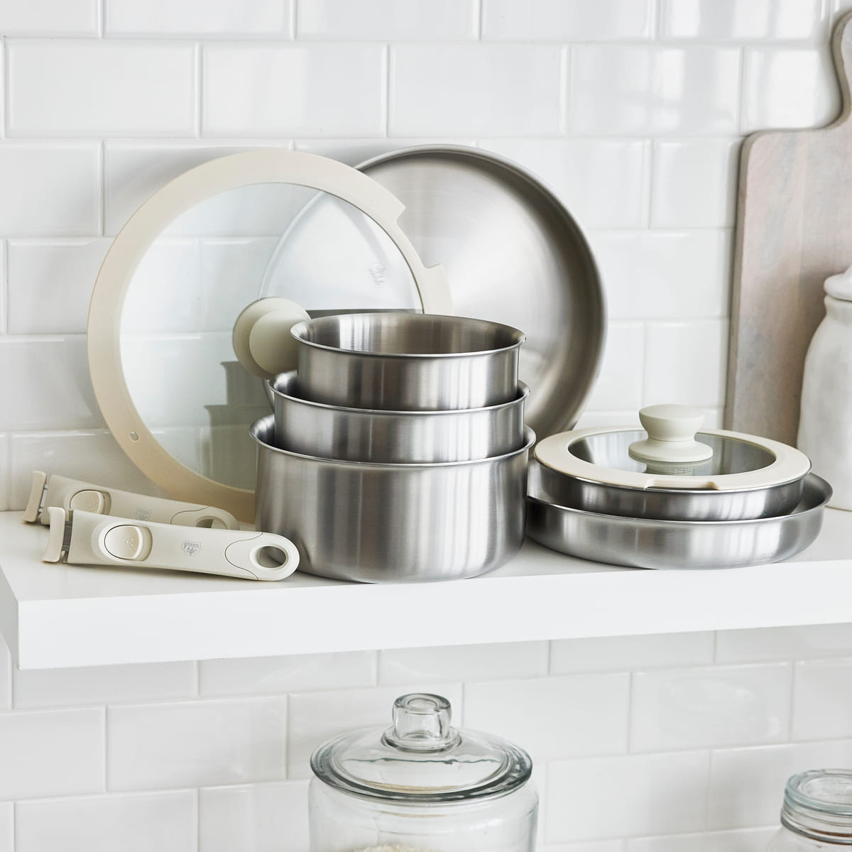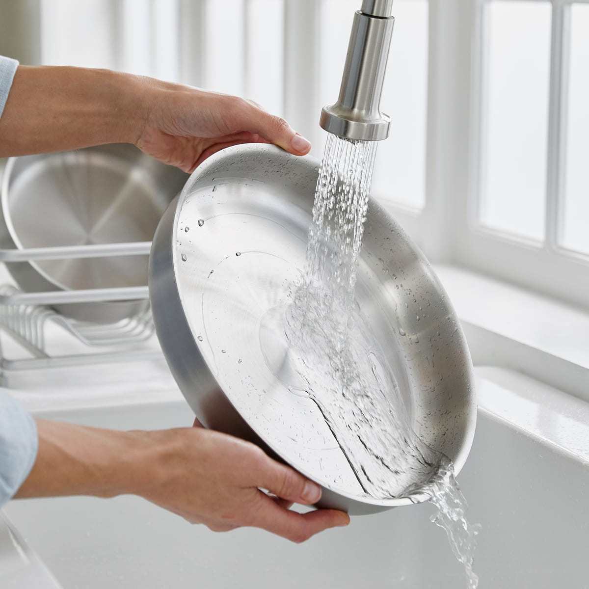 Space-saving design stacks pans neatly, saving up to 70% more cabinet space