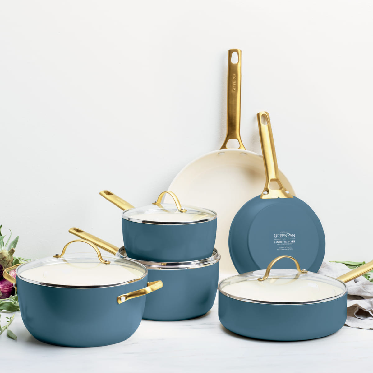 Taking inspiration from vintage designs, this collection’s scratch-resistant finish is balanced by the light ceramic non-stick interior